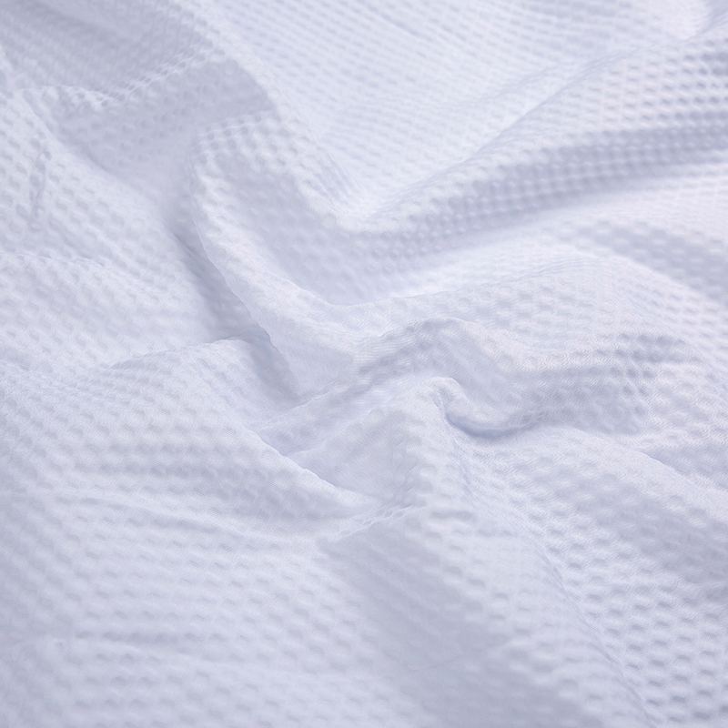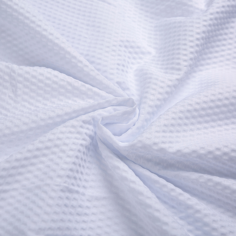 全滌壓泡面料是在染色織物的基礎上,用高溫金屬花棒在織物表面壓出起伏的泡泡。這種氣泡具有立體的凹凸感,與普通的平滑面料相比,皮膚感覺更加舒適。