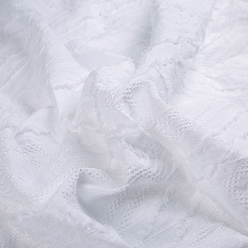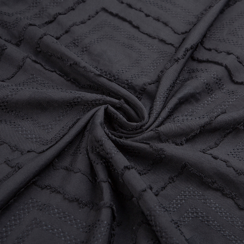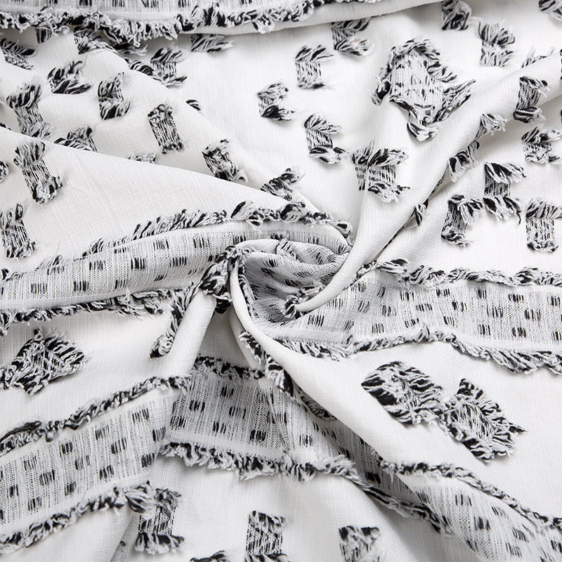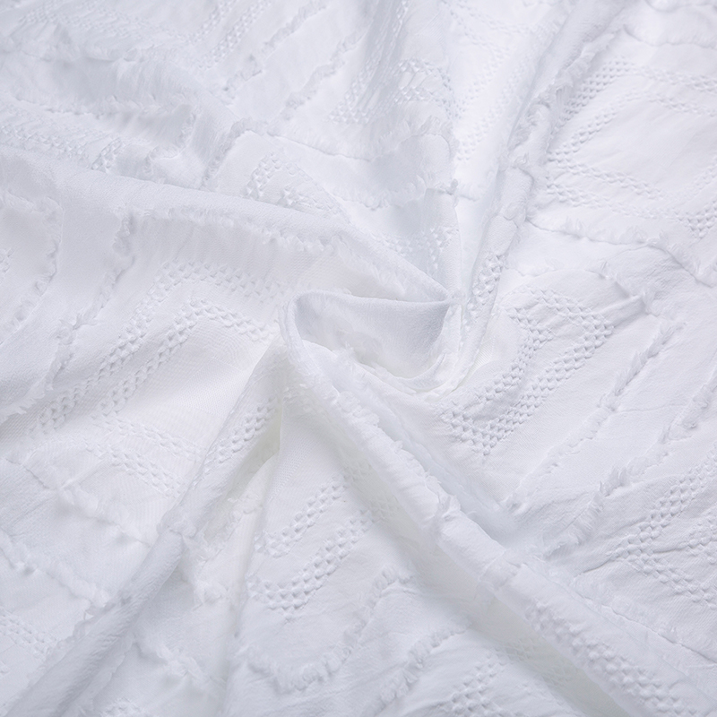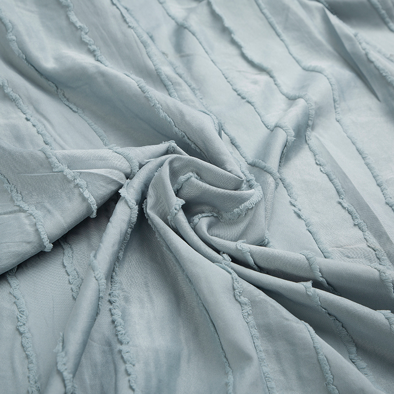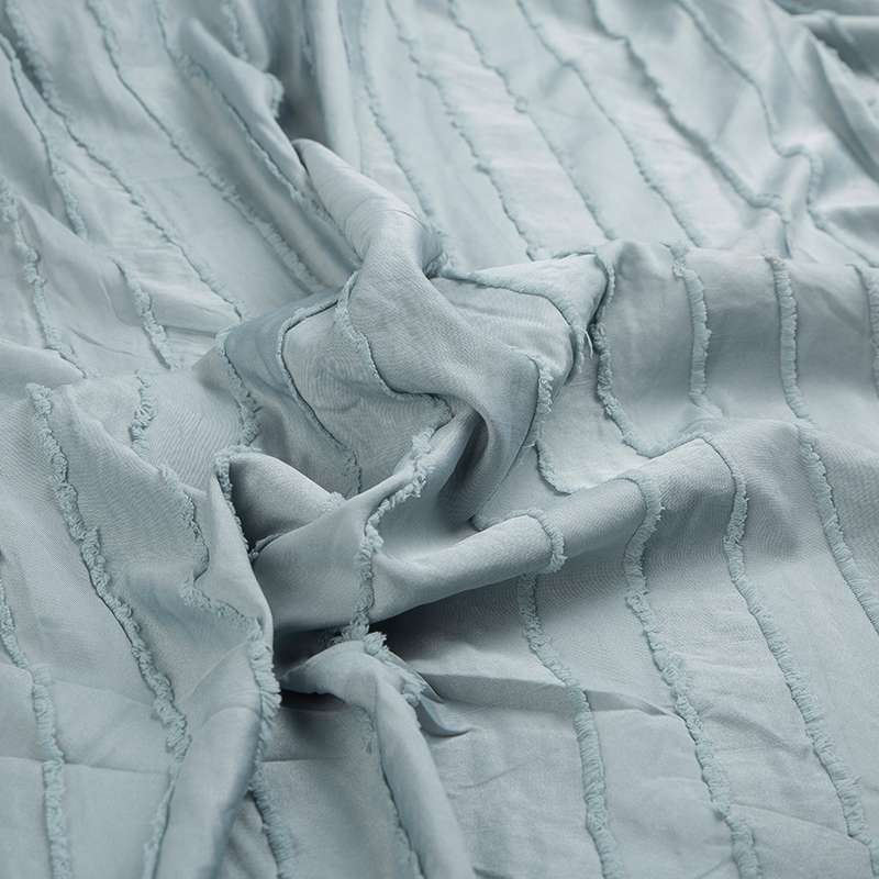 全滌剪花面料是我們公司新開發的產品。這種面料經過復雜的織造工藝和后處理,可以在表面產生凸起的花紋,而且這種花紋永遠不會消失。